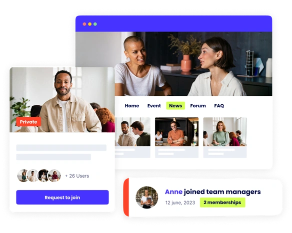 Groups can be private, public or even invisible to individual members, with access controlled by user criteria or membership level.